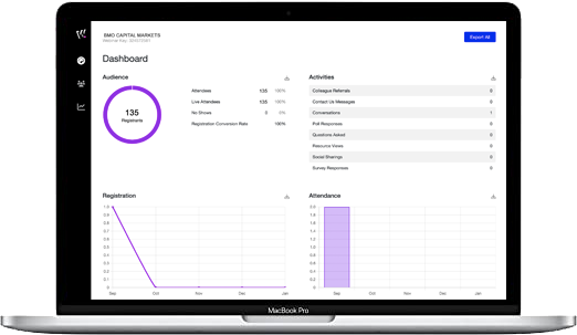 Your dedicated analytics link will allow you to monitor pre-registrations, live viewers and on-demand playback. Analytics reports can be downloaded for further analysis.