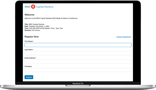 Your webcast experience begins with a registration page that includes a form to collect attendees registration information (First & Last Name, Email Address and Company Name). This information is then used to track viewing habits during live and on-demand periods. The webcast will be available for on-demand viewing for 3 months.